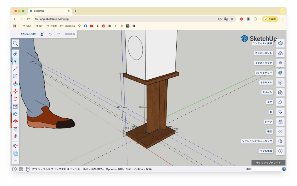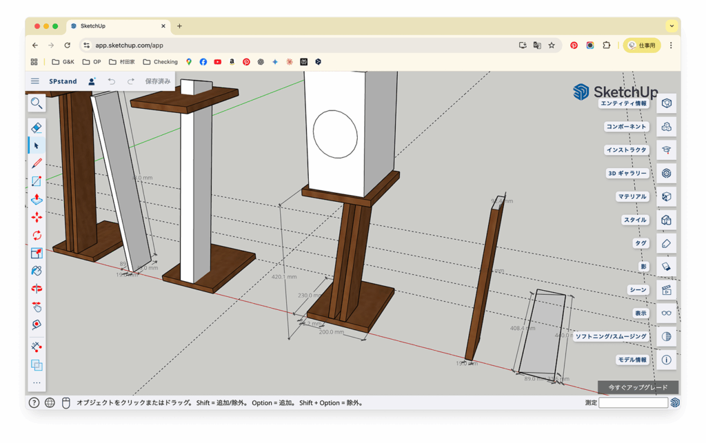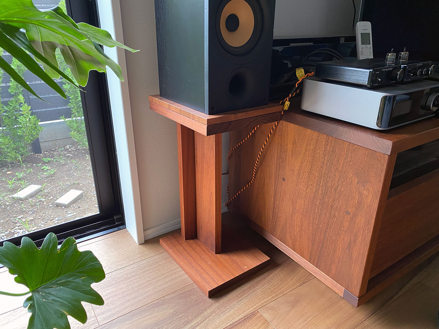 棚だけでは飽き足らず、さらに家具的なものとしてスピーカースタンドを製作。リビングにB&Wの小型スピーカーを置く場所が無かったからだ。スピーカースタンドは共振を抑える必要があり、安価で柔らかい木材では全く役不足だ。そこでウォルナット材を選んだ。(ホームセンターで1枚2,500円くらい?)デザインはSketchUpを使って図面を作成。このアプリ楽しい。ちょっと木材を斜めに使ったデザインも検討したが、極めてシンプルなほうがリビングに合うと思い、シンプルにデザインした。完成品はマスターウォールのテレビ台と並べても遜色ないほどの出来栄えになった。(写真では見えないが、ちゃんとネジ穴も同じウォルナットのダボで塞いでキレイに仕上げている)