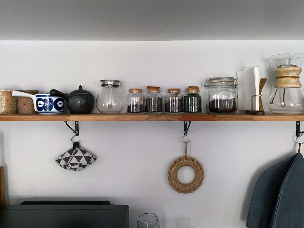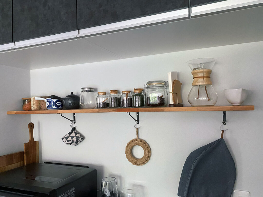 新居というのは、何もない「デフォルト状態」から始まる。そのままだと、微妙に無駄な空間が生まれたり、使い勝手が良くないところがあちらこちらにできる。そこでまず必要になるのが棚だ。DIYの大定番だ。押入れを有効に使うために奥の壁に可動棚を取り付けて収納を増やしたり、キッチンにはマホガニー材をホームセンターで購入し、オイル仕上げでちょっとおしゃれな棚を設置した。キッチンの棚の設置の際は、綿密に調査して壁に木材が通っているところに棚受けをしっかり固定できた。水平も完璧で満足だ。棚をいくつかつくる過程で、「DIYは綿密な設計・正確な墨付けが9割。あとは丁寧さと根性」ということを学んだ。